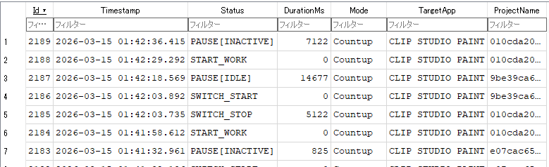 ログにはいつの作業なのか、どのイラストを触っているのかの情報も持っているので、後からどのイラストにどれだけ時間を掛けたのかも分析することが可能です。