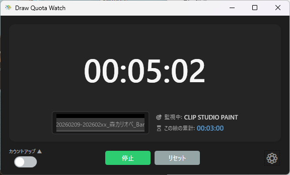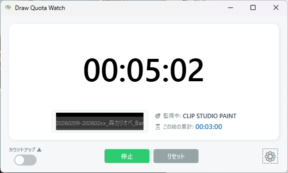 CLIP STUDIO PAINT(以下クリスタ)がアクティブ状態、かつクリスタがアイドル状態ではない場合に目標時間を1秒毎に減算。